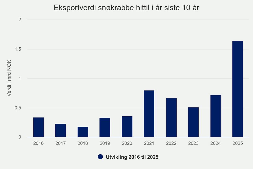- Norge eksporterte 7 610 tonn snøkrabbe til en verdi av 1,6 milliarder kroner i 2025