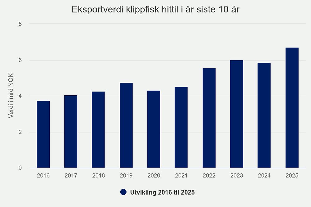 - Norge eksporterte 184 tonn tørrfisk til en verdi av 61 millioner kroner i desember