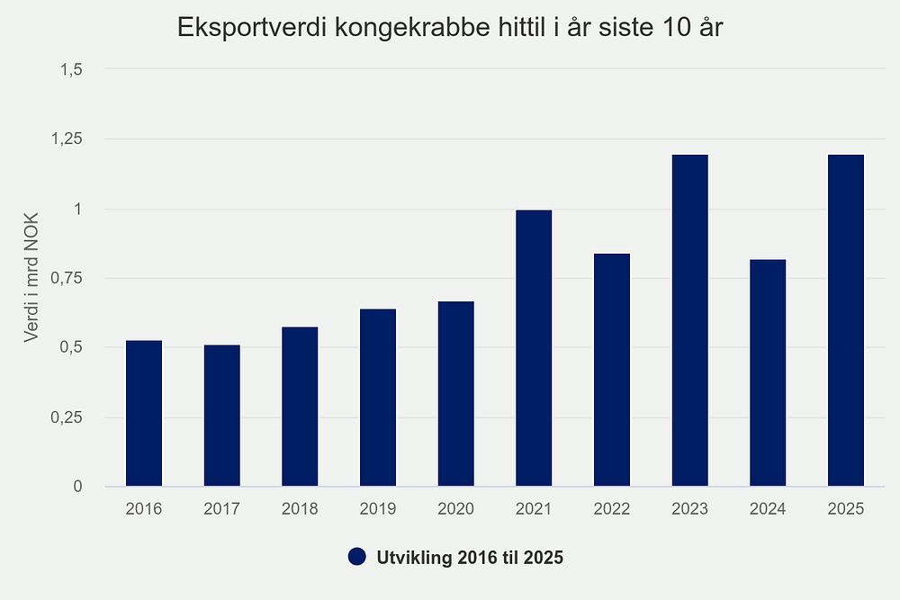 - Norge eksporterte 1 844 tonn kongekrabbe til en verdi av 1,2 milliarder kroner i 2025